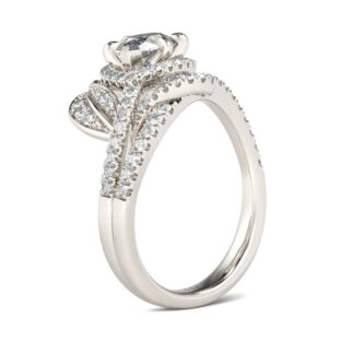 An amazing look to symbolize your loving commitment, this ring features a sparkling oval cut center stone wrapped in a frame of round stones, while additional round stones adorn the shank. The matching band features six shimmering halo round stones to complete this eye-catching design. This ring set is a beautiful beginning to your lasting…