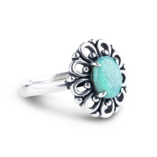 Experience the unique charm of the opal. Crafted in oxidized sterling silver, the ring will showcase a unique look on your finger. The floral like carving embraces the oval-shaped green opal. The ornate craft to the stone adds more fascination to the whole piece. Treat yourself or delight her with this dainty and delicate piece….