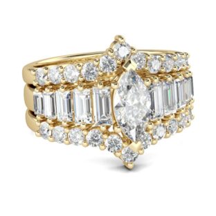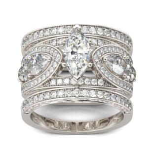 Simply exquisite, this shimmering bridal set brings all your dreams of a gorgeous proposal to life. This sparkling style features a marquise cut stone at the center, a pear cut stone and trios of round stones flank each side and nestles into the ring’s open shank. On your wedding day, two coordinating bands completes the…