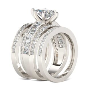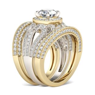 Sparkling and luxurious, this three piece ring set will capture your heart at first sight. Designed in two tone, it features a sparkling round cut center stone wrapped in a glistening halo frame,bringing out its beauty and sparkle. The coordinating bands are paved with round stones in three sides, making a dazzling look from every…
