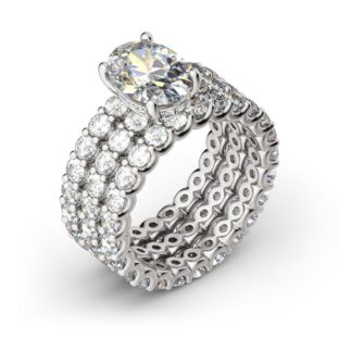 She is the type of person that makes forever seems too short. Treat beloved her to this stunning ring set that celebrates your endless love and passion. This design features a shimmering oval cut center stone set on an eternity band of sparkling round stones. Two eternity bands fit closely with the engagement ring, completing…