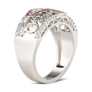 Express all the love you hold in your heart with this exquisite band. It features two rose gold tone heart at the center and shimmering round stones set on filigree style shank. Elegant and romantic, this band makes a stunning statement of love. Side Stone Number of Stones : 48 Carat Weight : 0.74 ct…