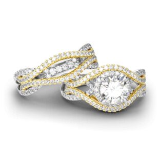 Stunning and breathtaking, this ring set honors the light of your life. Crafted in two tone sterling silver, the engagement ring features a round-cut center stone set on a two tone intertwined shank. Shimmering round stones are set on the shank to add extra sparkle to it. With the carefully crafted coordinating band, the ring…
