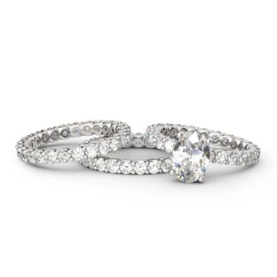 She is the type of person that makes forever seems too short. Treat beloved her to this stunning ring set that celebrates your endless love and passion. This design features a shimmering oval cut center stone set on an eternity band of sparkling round stones. Two eternity bands fit closely with the engagement ring, completing…