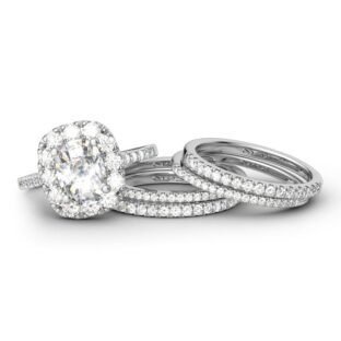 Ask for her hand with the elegant ring, and seal your commitment with equally beautiful wedding bands. Designed in feminine rose gold color, this beautiful design showcases a cushion cut center stone set on a halo-style setting, bringing out its beauty and sparkle. Additional stones glisten on the shank as well as the wedding bands….
