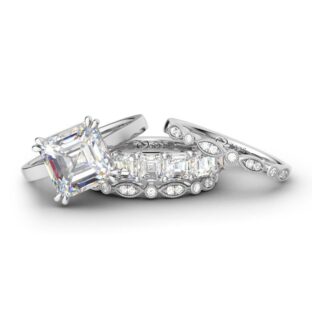 Designed to take her breath away, this four piece wedding set showcases a solitaire asscher cut engagement ring with three shimmering matching bands. Seven shimmering asscher cut stones are perfectly prong-set across the center of eye-catching band, while other two bands are decorated with alternating round and marquise-shaped designs. This set is a sweet symbol…