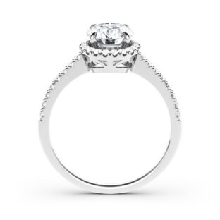 This engagement ring shimmers with all your beautiful moments to come. A brilliant round cut stone is wrapped in a halo frame of sparkling round stones, and additional stones extend halfway down each side of the thin band, adding extra shimmer to the look of the ring. Simply gorgeous, traditional and understated, this is the…