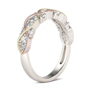 Make a commitment to your future with this sparkling tri-tone wedding band. It features dainty round stones in marquise-shaped frames lined with intricate milgrain detailing. With grace and shimmer, this sparkling band is a classic style that complements your sophisticated taste. Side Stone Number of Stones : 18 Carat Weight : 1.23 ct Stone Shape…