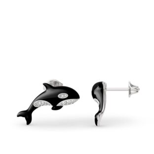 The Orca, commonly known as the Killer Whale, is a majestic creature often found raising above the waves and between icebergs.Our Orca earrings are made in sterling silver with black enamel and set with shimmering round stones.The overall effect is at once simple and stunning. Orca’s signify romance, long life and protection. Black and white…