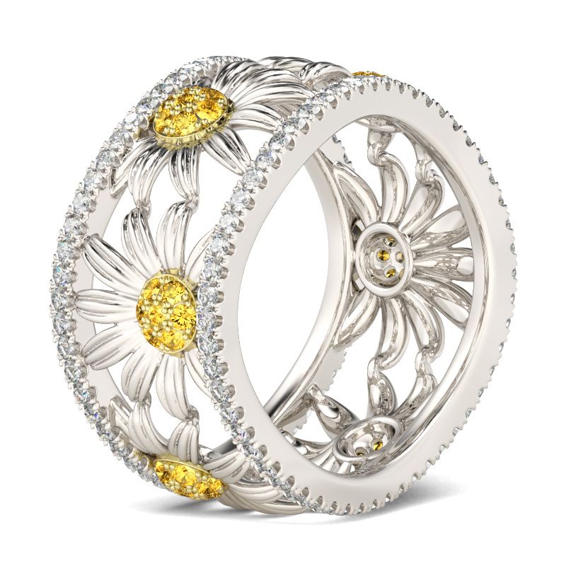 Elegant and beautiul,this flower ring will capture your heart at first sight! Flower is one of the most popular design elements in jewelry. It’s often related with beauty,vitality and happiness, like your love. Crafted in two tone sterling silver, sculptured in six sunflowers in the cut-out shank of the ring. Every sunflower is set with…