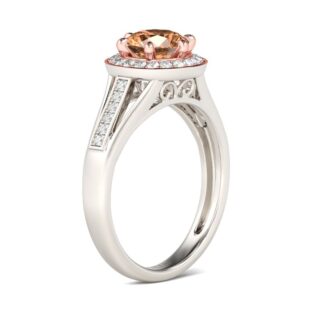 Showcasing timeless, enduring beauty, this ring will capture your heart at first sight. Expertly crafted in two tone sterling silver, the eye is drawn to the six-prong setting 7mm champagne center stone wrapped in a glistening halo of round stones. The split shank is set with shimmering round stone in the middle. Treat yourself or…