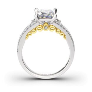 Classic and beautifully decorated, this glistening engagement ring is an heirloom look of love. A sparkling princess cut center stone and additional stones on the split shank create incomparable brilliance in any angle. Along the edges of the shank, yellow gold color scrollwork add beauty and elegance to the design. This beautiful ring is timeless…